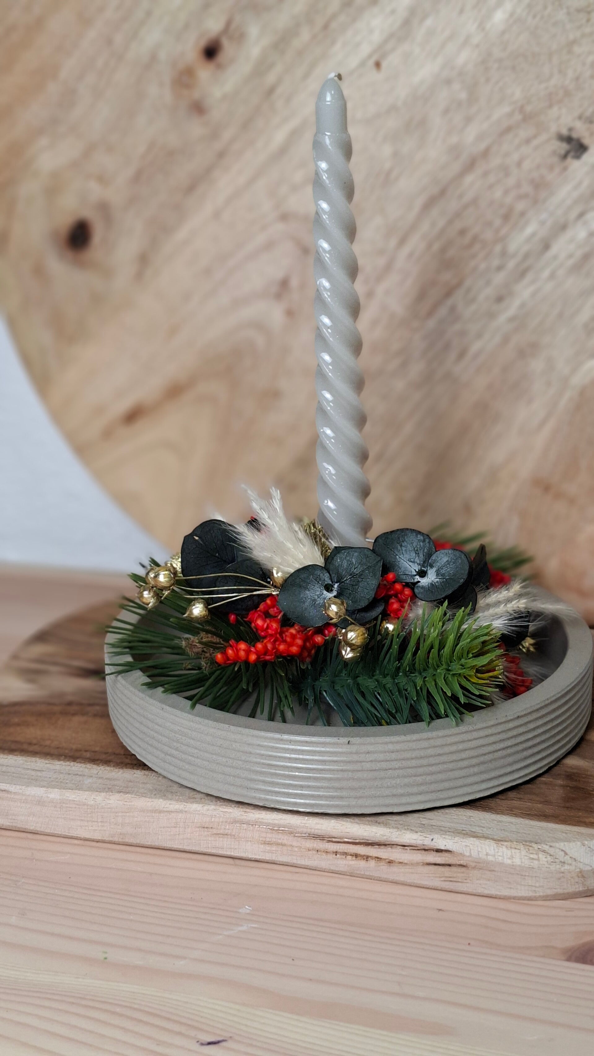 Kleiner Betonteller mit Stabkerze. Geschmückt von einem weihnachtlichen Trockenblumenarrangement