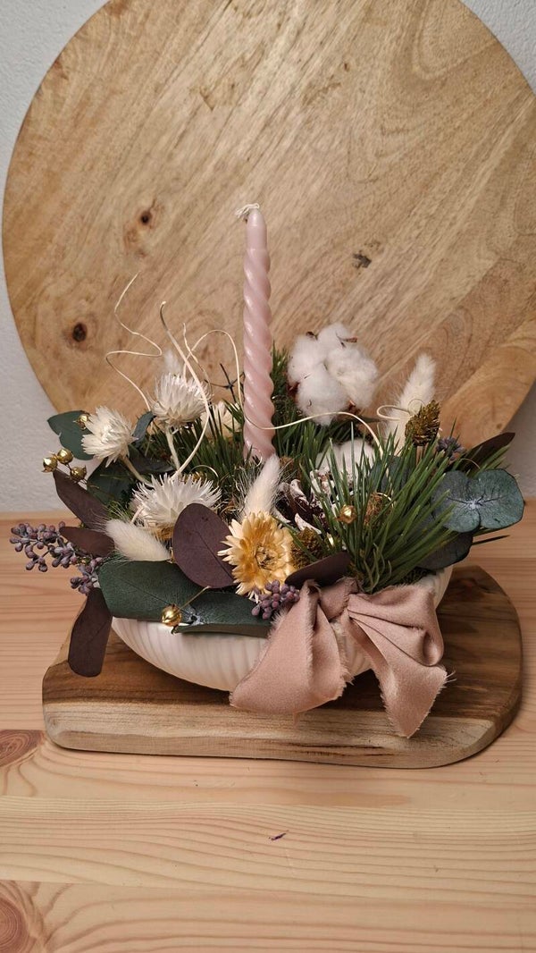 Diese liebevoll handgefertigten Adventgestecke bringen weihnachtlichen Zauber in dein Zuhause - ganz ohne abnadeln und ohne Pflege. Arrangiert in hochwertiger Gips-Schale (20 cm) mit edlen Trockenblumen, Naturmaterialien und Stabkerzen, entsteht ein festliches Einzelstück, das jedes Jahr Freude schenkt.