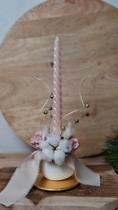 Gegossene Tanne mit Stabkerze und liebevoll arrangierten Trockenblumen auf kleinen goldenen Teller